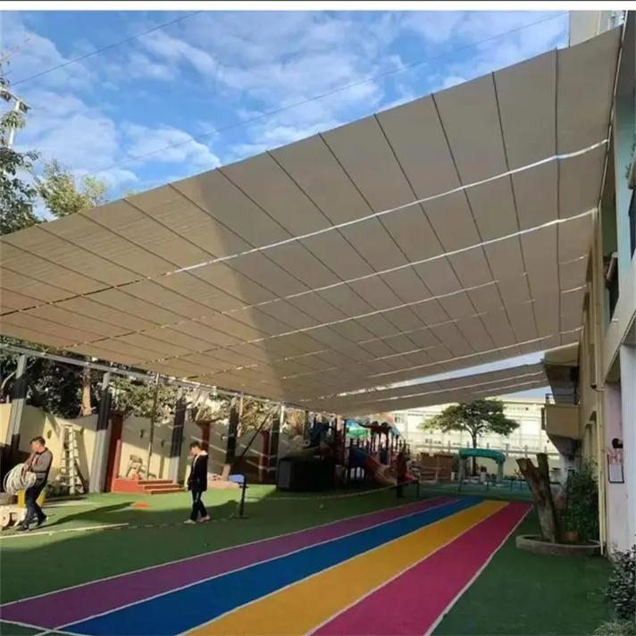 金丽彩幼儿园户外遮阳帘的遮阳率可达**95%**。 这款遮阳帘采用高密度聚乙烯网孔面料制作成高日晒电动遮阳天幕,除了能达到95%的高遮阳率,该面料还让产品拥有较长使用寿命,且质保长达15年,适配幼儿园户外长期使用的需求,搭配其抗UV的特性,能为孩童有效隔绝烈日带来的暴晒困扰。